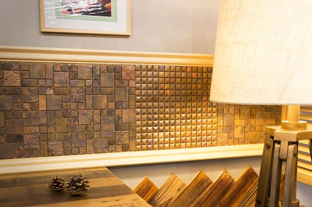 陶器製モザイクタイルの表面に銅板を張った個性的なアイテム。立体加工をほどこした銅板が光をやわらかく反射し、アンティークのような雰囲気を演出する。