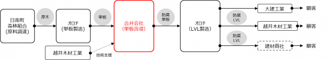 出資比率は、大建工業70%、オロチ14%、日南町森林組合10%、越井木材工業6%。