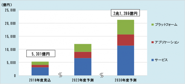 2018年度の国内市場規模は5301億円を見込む。現状では実証実験が中心となるものの、金融業や製造業などでの本格的なAI導入により市場が拡大。今後、さまざまな業種での導入が予想される。2030年度の市場規模は、2017年度比5.4倍の2兆1286億円と予測する。