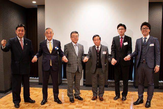 調印式の後に記念撮影。左から長井克之塾長、寿ホームズ・杉島篤美社長、HORI建築・堀昌彦社長、橋本興産・楊井章夫事業部長、円建創・安達陽輔取締役、丸尾建築・丸尾幸司社長(写真提供:住宅産業塾)