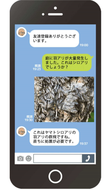 ゴールデンウイーク前後は、シロアリの羽アリの群飛がはじまる時期で、営巣を放置するとシロアリ被害に遭う可能性がある。「この虫なに?」は、LINEのトーク機能を使ったサービスで、部屋の中や家の周囲でシロアリらしき虫や糞粒、卵のようなものを見かけたら、その写真や周囲の状況が映った写真を送れば、同社イメージキャラクターの「ボレイトくん」がどんな虫なのか返答し、場合により対処方法等のアドバイスを行う。