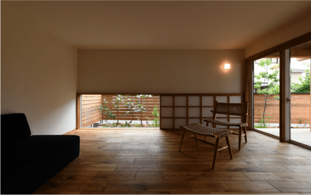 障子は、直接光を拡散する働きがあるため、柔らかい光環境をつくると同時に外からの視線を抑えてくれます。地窓は、床に反射した光を天井に拡散します。植栽を配置してフェンスなどで敷地を囲うことで限られたスペースでも情緒性を高めることができるため、風景的な利点が少ない立地におすすめの手法です。