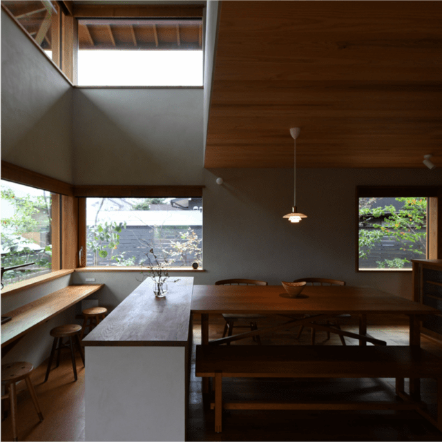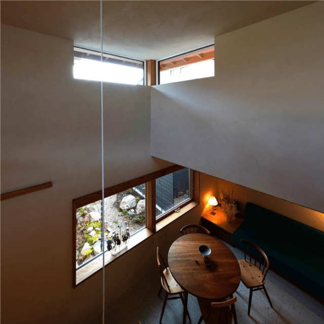 「織姫の家」。名古屋市内の過密・高層型立地にある狭小地。北側道路になっており、南は高層ビル、東西は3階建ての建物に隣接するため、北側にわずかに開いた空の抜けを切り取る窓を配置し、2階LDKにコーナー窓を配置。コーナーに窓を配置すると、目線が対角に誘導されるため「広がり間取り効果」が生まれる。コーナー窓から入った光は漆喰に反射して柔らかくなり、勾配天井を通じてロフトまで導かれる
