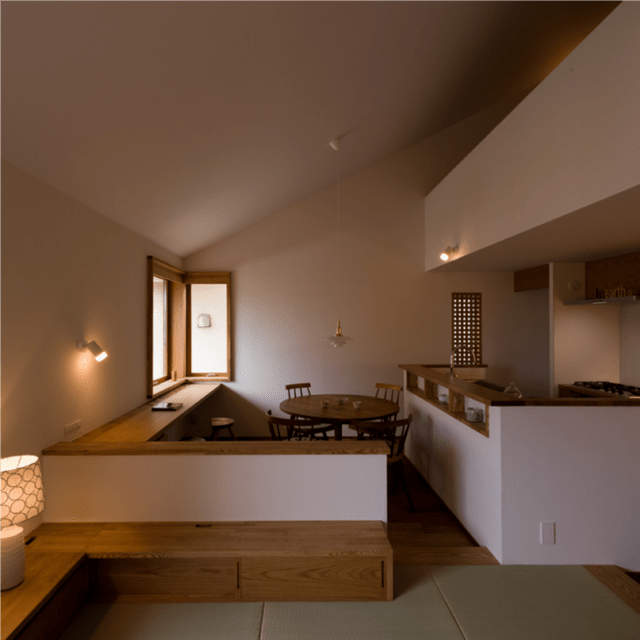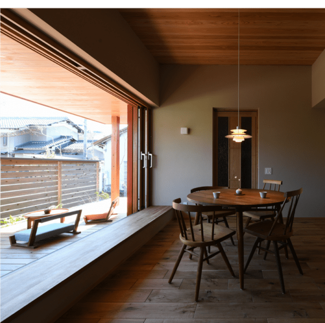 「大真屋の家」。過密型立地に建つ事務所併用住宅。土地は約90坪と広大だが、東側に8台分の駐車スペースがあるため、居住空間はそこまで大きくなく、わずかな庭とデッキ空間を重ねて配置した。東側から入る光をデッキ材、軒天の反射を利用して導光することで陰影のある室内空間を目指した。内部は[ダイニング→リビング→キッチン(水回り)→畳の小部屋]がつながる回遊性のある間取りとし、導光結果の違いにより、それぞれの部屋で陰影と居心地の違いを楽しめる