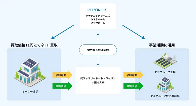 電力会社の固定価格買取期間(10年)を満了した卒FITオーナー向けのサービスで、提携先の小売電気事業者を通じて付加価値をつけた買取価格(11円/kWh)を設定することで、大手電力会社よりも経済的なメリットを提供する。4月からは、PLTグループ住宅会社の展示場や事務所において、Sustech(サステック)から購入したオフサイトPPAモデルによる再生可能電力を活用。61案件への導入を皮切りに、2030年度には住宅展示場における事業活動での使用電力の再生可能エネルギー化率を向上させるという。再生可能エネルギー活用の取り組み強化し、余剰電力活用による再生可能エネルギーの循環を図ることで、国際イニシアティブRE100達成を目指す。