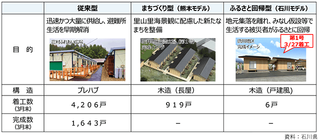 発災当初は避難所生活を早期解消する目的で、迅速かつ大量に供給可能な従来型のプレハブ住宅の建設を進めてきた。しかし、2月以降は中長期的な視点から、里山里海景観に配慮した新たなまちの整備に向け、まちづくり型の木造長屋住宅の建設に着手している。