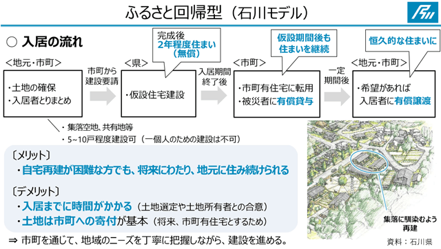 さらに3月末からは、地元の集落を離れてみなし仮設などで生活している被災者が帰還できるよう、ふるさと回帰型の木造戸建風住宅(石川モデル)を穴水町唐川地区に建設した。ふるさと回帰型住宅は、後々に市・町営住宅に転用することを前提に建設。希望があれば入居者に有償譲渡することも想定している。