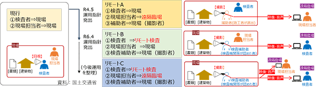 リモート検査については、「デジタル技術を活用した建築基準法に基づく完了検査等の検査者の遠隔実施に係る運用指針【令和6年4月版】」(PDF)を新たに公表。検査補助者を現場に立ち会わせ、検査対象建築物の状態、計測・動作確認の状況の映像などを検査者に送信する「リモートB」が追加された。今後、受検者の遠隔立会いと検査者のリモート検査を組み合わせた「リモートC」の運用についても検討・協議が行われる。