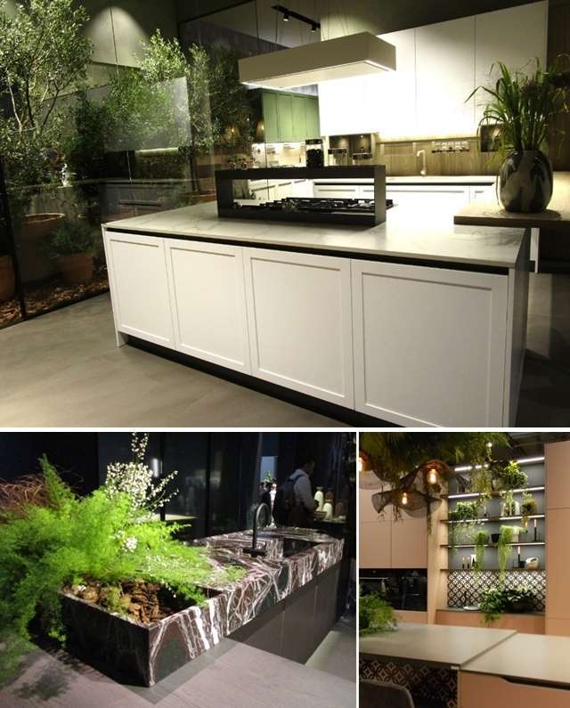 キッチンのどこにおいてもあるだけで目も心も癒される。壁面にキッチンプランツなどをハンギングしてデザインと実用を兼ねて楽しむスタイルも多い(Stosa/Bimnova/Nobilia)