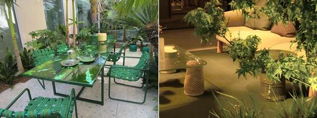 キッチンリビングに続くアウトドアリビングにはグリーンを配置する設えは欠かせない。左:PaoraLenti 右:Kettle