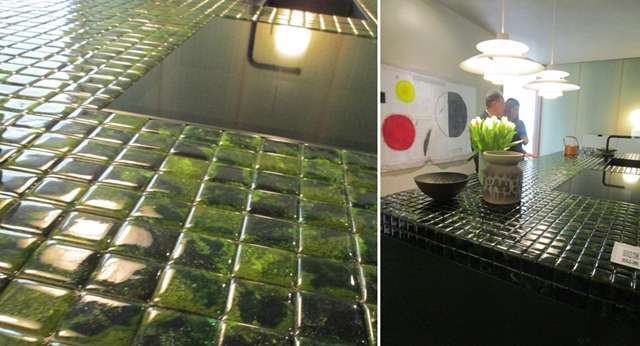 リサイクルガラスをワークトップに使用。アウトドアでもテーブルトップなどに多用されている素材、美しいカラーが魅力(Paora Lenti)