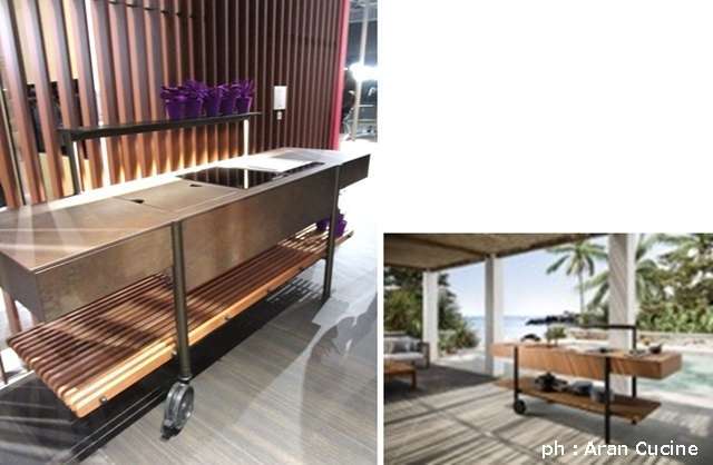 無垢チーク材にフレームはアルミブラック塗装。TOPはシンタードストーン(セラミック)。キャスター付き(Aran Cucine)