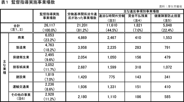 厚生労働省はこのほど、長時間労働が疑われる事業場に対して行った労働基準監督署による指導結果について報告した。指導を行った事業場は2万6117事業場で、このうち違法な時間外労働があったのは1万1610事業場(44.5%)。指導を受けた事業が最も多かった業種は「商業」で、6053事業場(23.2%)。建設業は1819事業場(7.0%)だった。他に、賃金不払残業が1821事業場(7.0%)、健康障害防止措置の未実施が5848事業場(22.4%)あった。