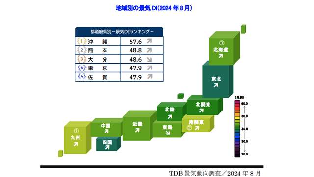 地域別では、「北関東」「九州」など10地域中9地域が改善し、「東海」のみ悪化。「北関東」(42.1)は、活発なリフォーム需要が中小企業の改善の一因となった。「九州」(47.3)は8県中5県が改善、3県が悪化するなど明暗が分かれた。「建設」では都市開発や工場の建築、設備投資が景気を押し上げた。「東海」(43.7)はマンション建設や観光が押し上げ要因となったが、自動車の減産や夏の繁忙期に直撃した台風や地震の影響を受けた。