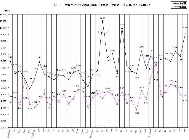 新築マンション価格の推移(首都圏・近畿圏)2021年8月~2024年8月