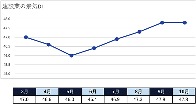 帝国データバンク(TDB、東京都港区)が11月6日公表した、2024年10月の景気動向調査結果によると、景気DIは前月比0.3ポイント減の44.3となり、4カ月ぶりに悪化した。「建設」のDIは47.8で、前月から横ばいとなっている。防災・災害復旧工事や大都市圏での再開発が好調だった。今後の見通しでは、景気DIは同0.2ポイント増の44.5となると予想した。