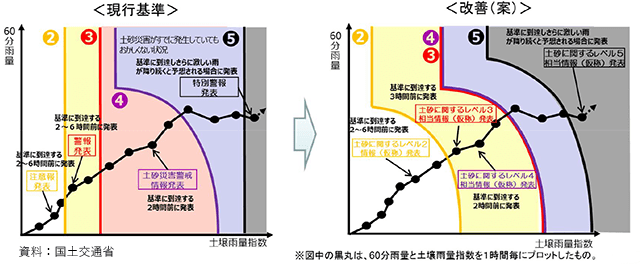 土砂災害警戒情報については、発表基準(CL)の更新を実施。警報の空振りや見逃しの発生頻度を減らすため、気象庁などによる最新の降雨予測技術を活用した、新たな土砂災害警戒情報の発表方法について検討する。