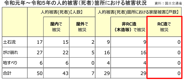 国土技術政策総合研究所(国総研)の調査によると、2019年~23年に発生した土砂災害により生じた人的被害(死者あり)は31箇所で、このうち25箇所は土砂災害警戒区域に指定されていた。家屋の被災戸数29戸で、すべてが非RC造だった。一方、RC造建物については躯体が被災または流出した事例はこれまでになかったが、建物の窓や扉、シャッターなどから土石流が流入し、屋内が被災した事例はあったという。