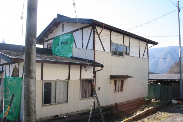 松本から片付けに来ていた女性の家は、同じく大きな小屋組みを持ち、築200年。昔の茅葺き屋根が瓦に葺き替えられている。「いつもは母が一人で住んでいるけれど、地震があった日はたまたまいっしょに松本にいた。戻ってみたらこの状況で、大黒柱に小さなひびが入っていた」