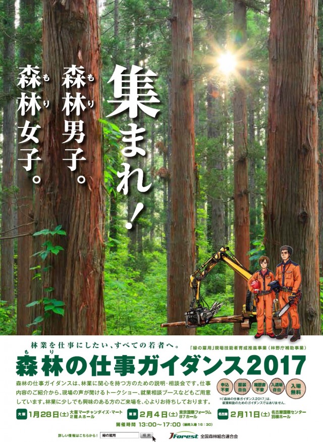 全国森林組合連合会(東京都千代田区)は、林業就業相談会「森林の仕事ガイダンス2017」を1月28日に大阪、2月4日に東京、2月11日に名古屋で開催する。参加予定都道府県の林業労働力確保支援センターや森林組合連合会が相談ブースを設け、各地の林業に関する情報や林業作業の内容、就業までの流れについての説明を行い、来場者からの相談に応じる。