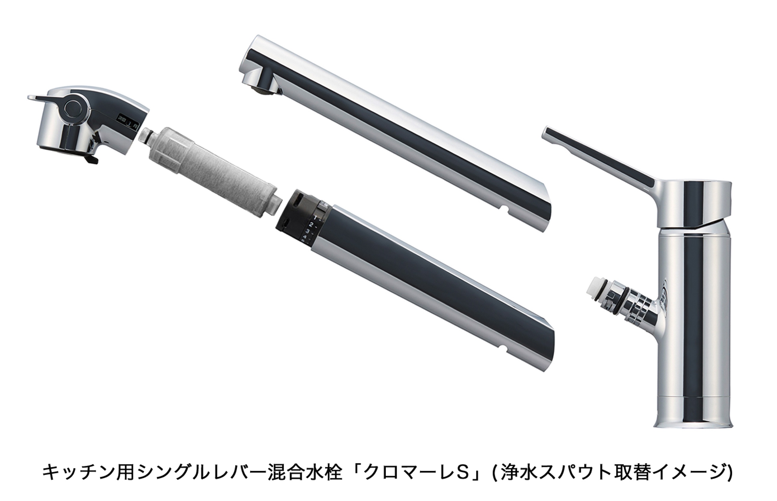 独自のスパウト取り替え構造とシンプルなデザインが評価され「グッドデザイン賞2016」を受賞した。クロマーレSが3万2500円、ノルマーレSが2万7500円、取替浄水スパウトが6300円。