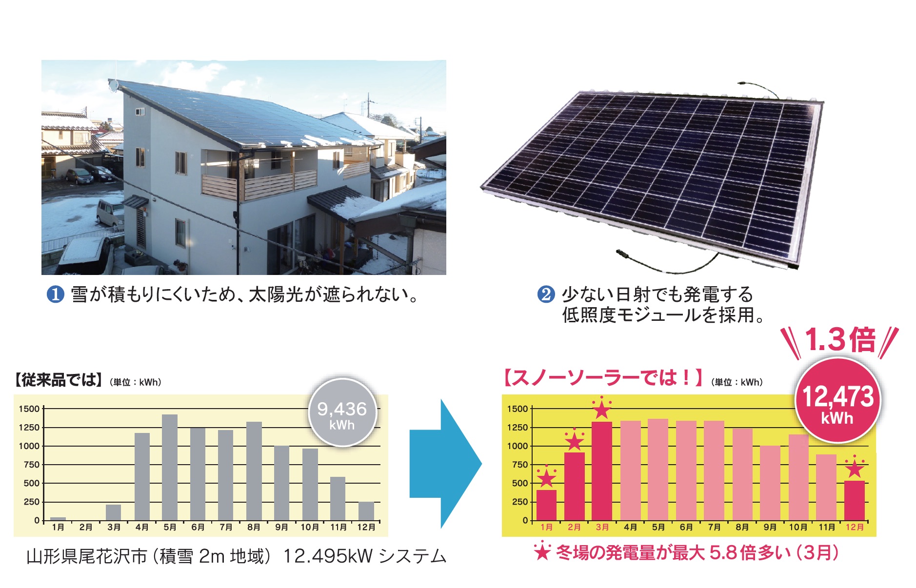 同社は4年間にわたり、約300件の施工事例を使ってさまざまな積雪量・雪質の条件下でデータを計測。発電性能と安全性を実証し今回、雪国専用として製品化した。