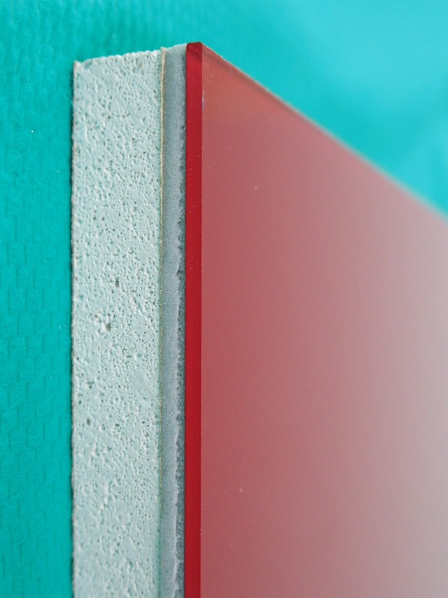 新商品は、ラコベルに樹脂を複合することで60%軽量化、薄型化したもの。壁面への貼り付けが容易になったため、ガラス施工専門業者でなくても扱うことができる。また、店舗やオフィスだけでなく、一般住宅でも使うことができる。
