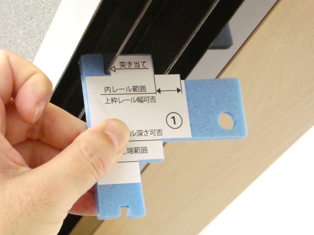 現場調査や見積もりの手間も簡素化。既存枠にあてるだけで取り替え可能な窓かどうかを一発判定できる「現調キット」(写真)、既存枠の幅・高さを測定してその場で簡単な見積金額を提示できる「シンプル価格設定」を用意した。