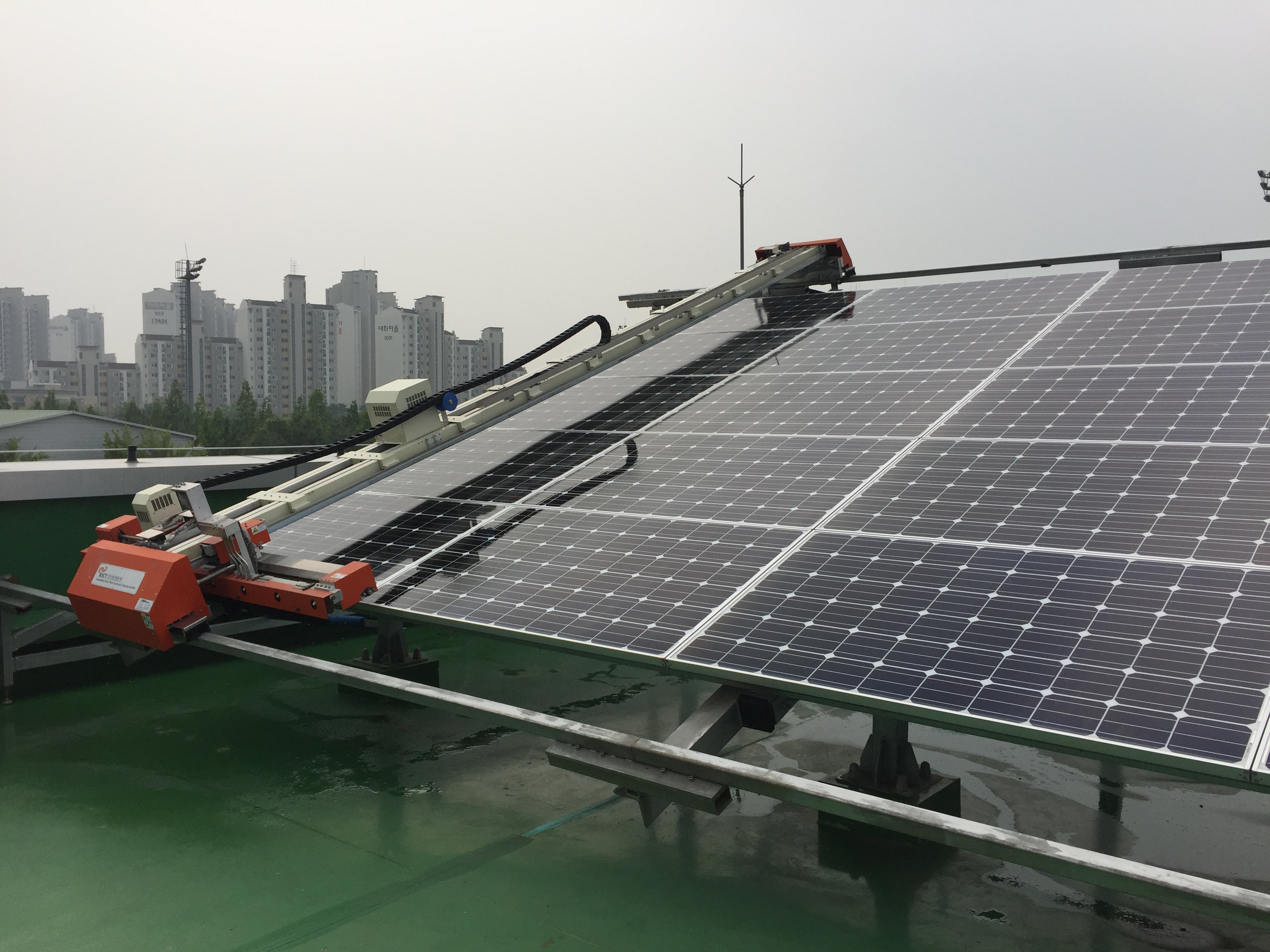 今回発売するのは、太陽光パネルの洗浄+「サーファシールドG」の塗布を1台で可能にするもの。太陽光パネル洗浄器具メーカーとのタイアップで実現した。これを利用することで、施工費の軽減、工期短縮、施工品質の均質化につながるとする。