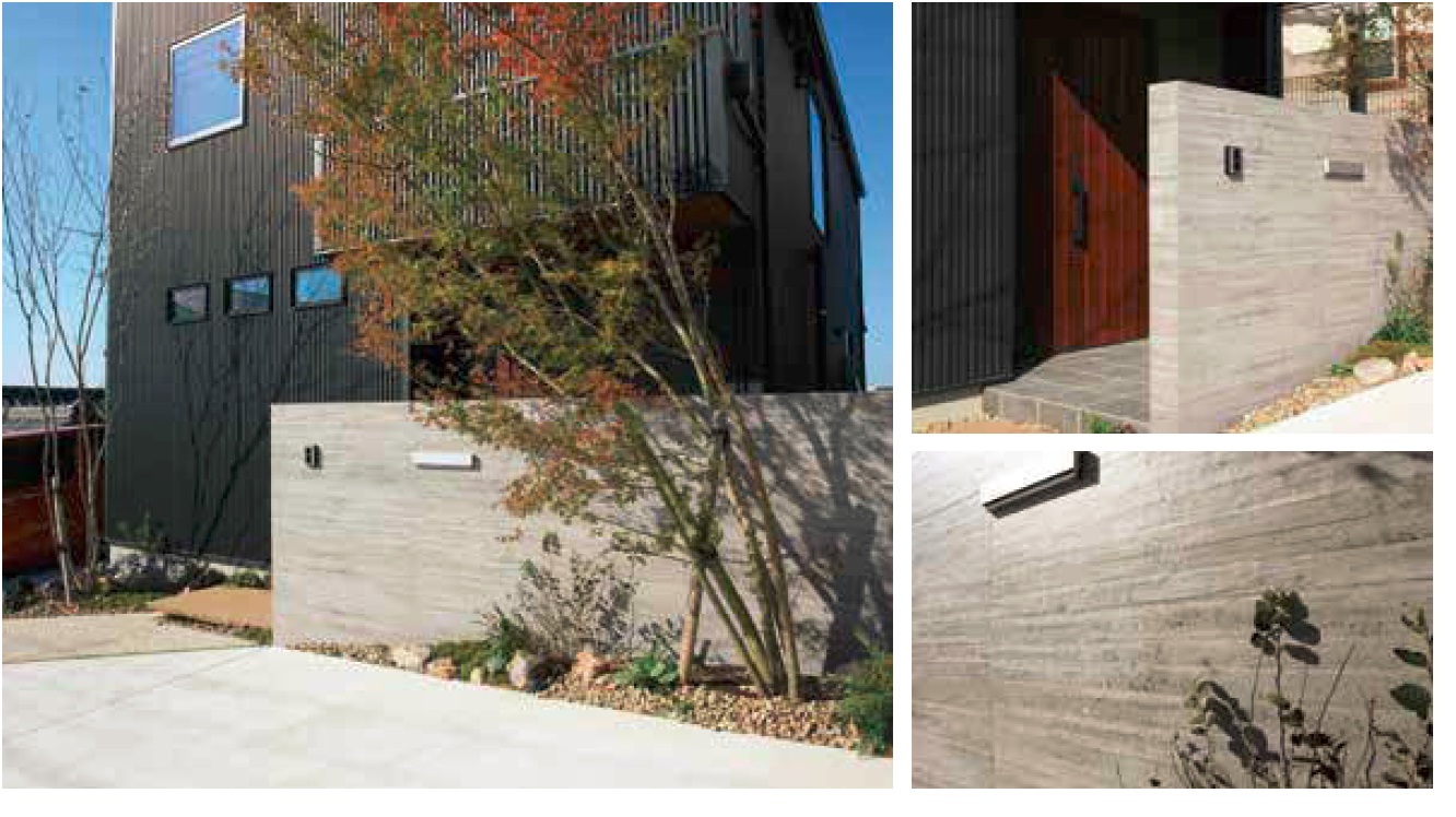 タイル施工と同様、接着剤で貼りつけるだけの乾式工法を採用。型枠を組んだりコンクリートを乾燥する手間をかけることなく、杉板目を転写したコンクリート調壁面を容易につくることができる。 299x1200mm。
