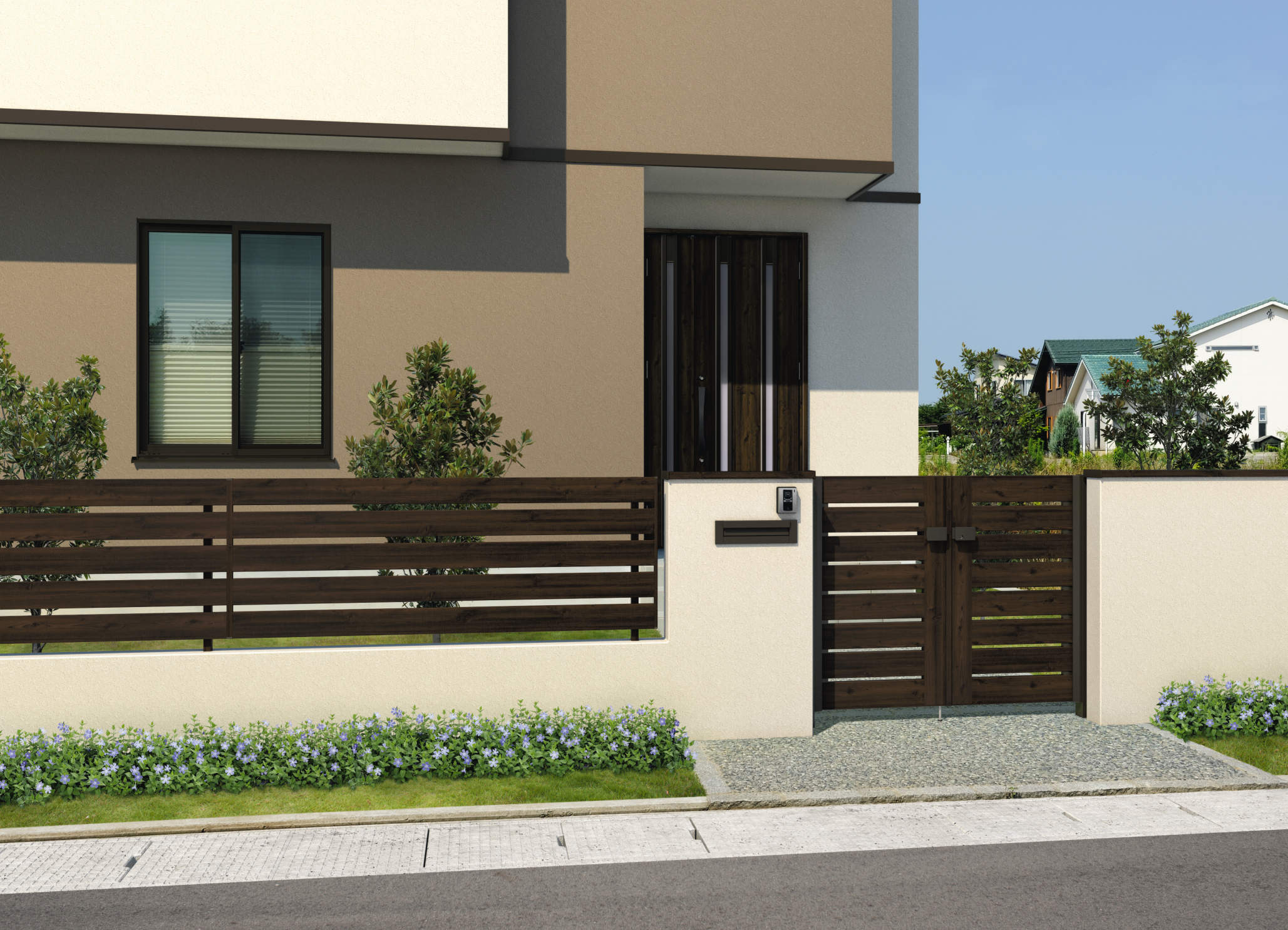 木調11色、アルミ2色をそろえることで、さまざまな住宅スタイルの色調にあわせることが可能。細部の木質感にもこだわり、門扉は門柱・上端部・上桟部・たて框・すき間ガードまで、フェンスは支柱・上桟目板・下桟目板・端部まで木調色を設定した。