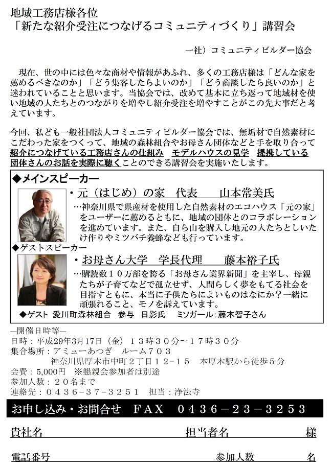 内 容 地域の森林組合や団体と協力し紹介受注へとつなげている工務店の話を聞くことができるセミナー。メインスピーカーは県産材を使用した自然素材のエコハウス「元の家」を建てる民家工房常栄(神奈川県厚木市)代表の山本常美氏。詳細・申込はこちらから。