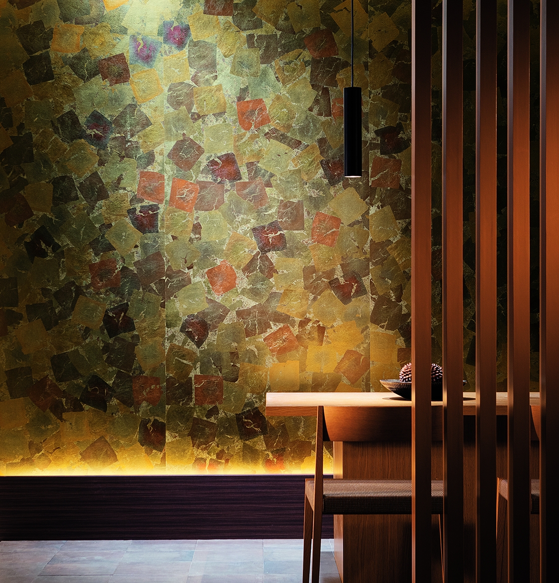 金銀箔は、平押しのベーシックなデザインからグラデーションのあるモダンなデザインまでそろえ、箔の神秘的な美しさを引き出した。