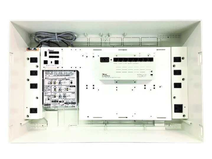 情報盤は、住宅内のマルチメディア情報配線システムの中枢を担うもの。新しいATFタイプは従来品よりも横幅を20%スリム化しつつ2層にすることで収容力を向上。前面カバーの下半分を情報機器設置用トレイとして利用できるようにし、取り回しやすさも高めた。計8口の電源を標準装備する。