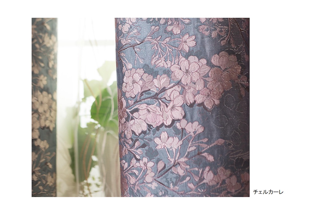 花の重なりや枝ぶりを描き、1年を通じて使える柔らかい雰囲気の新柄。ポリエステル素材で防炎・ウォッシャブル機能付き、ドレープ4柄16アイテム。1万2800円/m2〜。