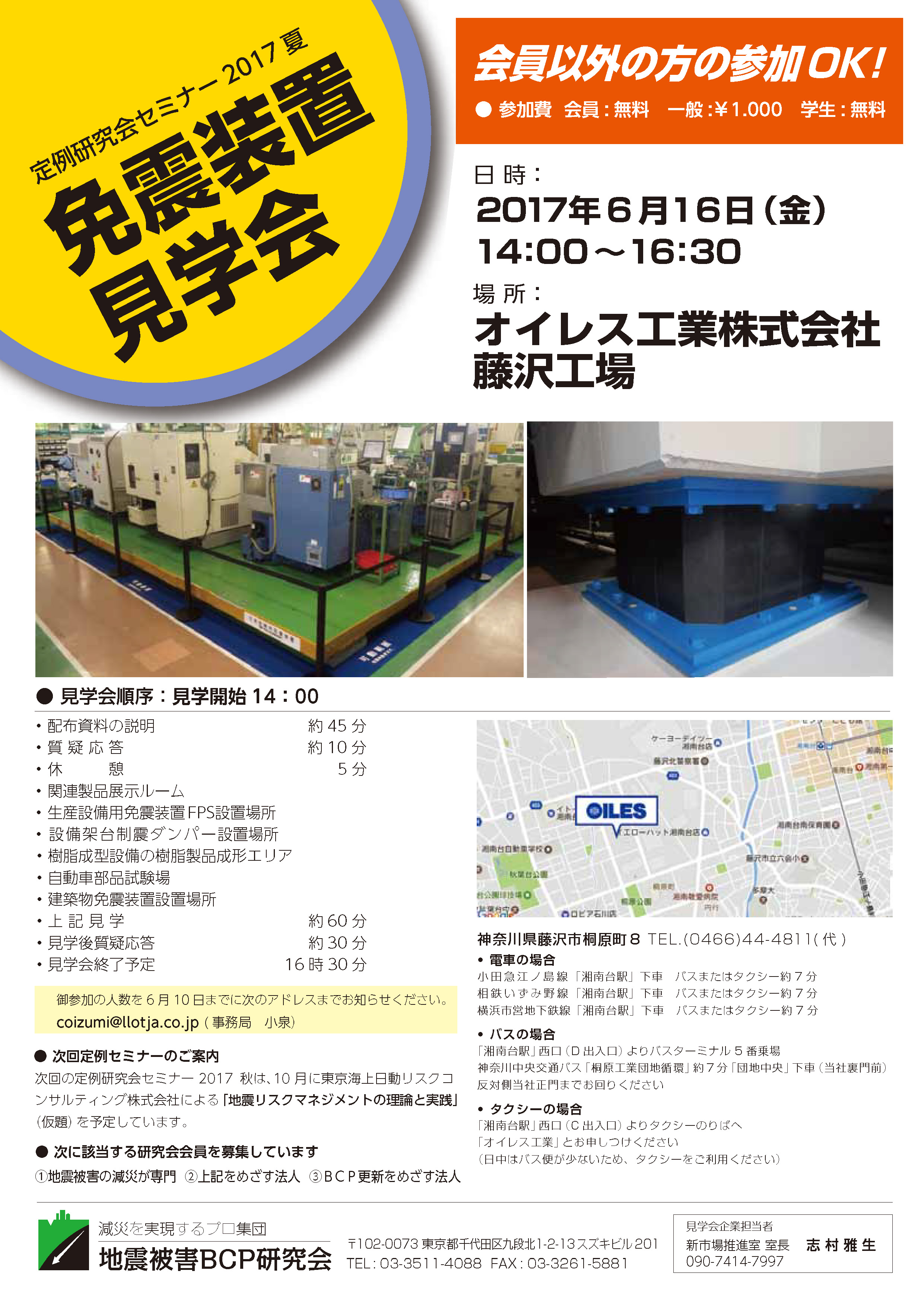 内 容 地震被害を想定した事業継続計画(BCP)に関するノウハウを学びレベルアップを図る場として2016年7月に設立された「地震被害BCP研究会」による免震装置の見学会。生産設備用免震装置FPS設置場所や樹脂成型設備の樹脂製品成型エリアなどを見学することができる。