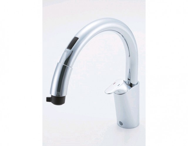 新製品では、デザインをシンプルにし、低価格を実現。従来のハンドシャワー付きシングルレバー混合水栓(同社価格:5万8000円(税別))に2万円をプラスすればタッチレス水栓にできるよう、価格は7万8000円(税別)とした。浄水器ビルトイン型も同時発売した。