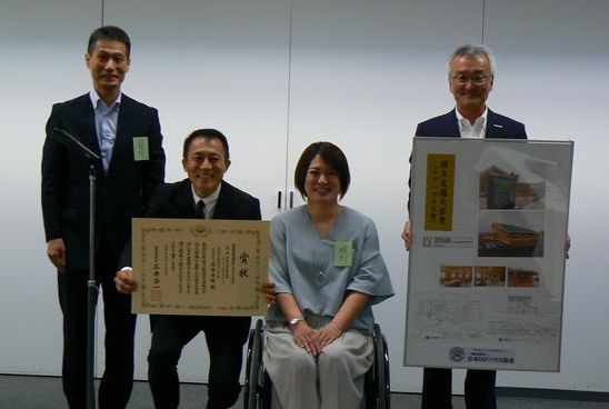 「多世代共生型施設(みんなで笑顔木のおうち)」は、石川県産のかが杉を使った二階建てのログハウスで面積670m2の複合施設。施設内には児童デイサービス、接骨院、リハビリトレーニング室、カフェ、ベーカリーショップがあり、訪問看護ステーションの機能も備えている。授賞式には施主の施設経営者、兼氏浩子さんも来場した。兼氏さんは、「住み慣れた地域で誰もが気軽に集える場所を作りたかった。ここでなら何でも話せる、という癒しの空間を作るには木の香りやぬくもり、温かさが感じられるログハウスが最適だと思った」と施設をログハウスにした理由を語った。その思いを裏付けるようにオープン初日には地元の住民1000人あまりが来場した。