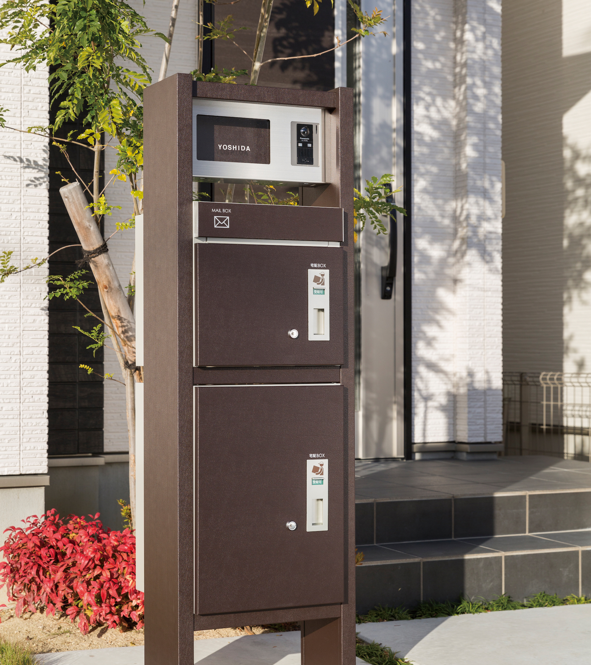 ダンボールの宅配物が入る宅配ボックスと、メール便が受け取れる郵便ポストを一体化したスッキリデザインが特徴。