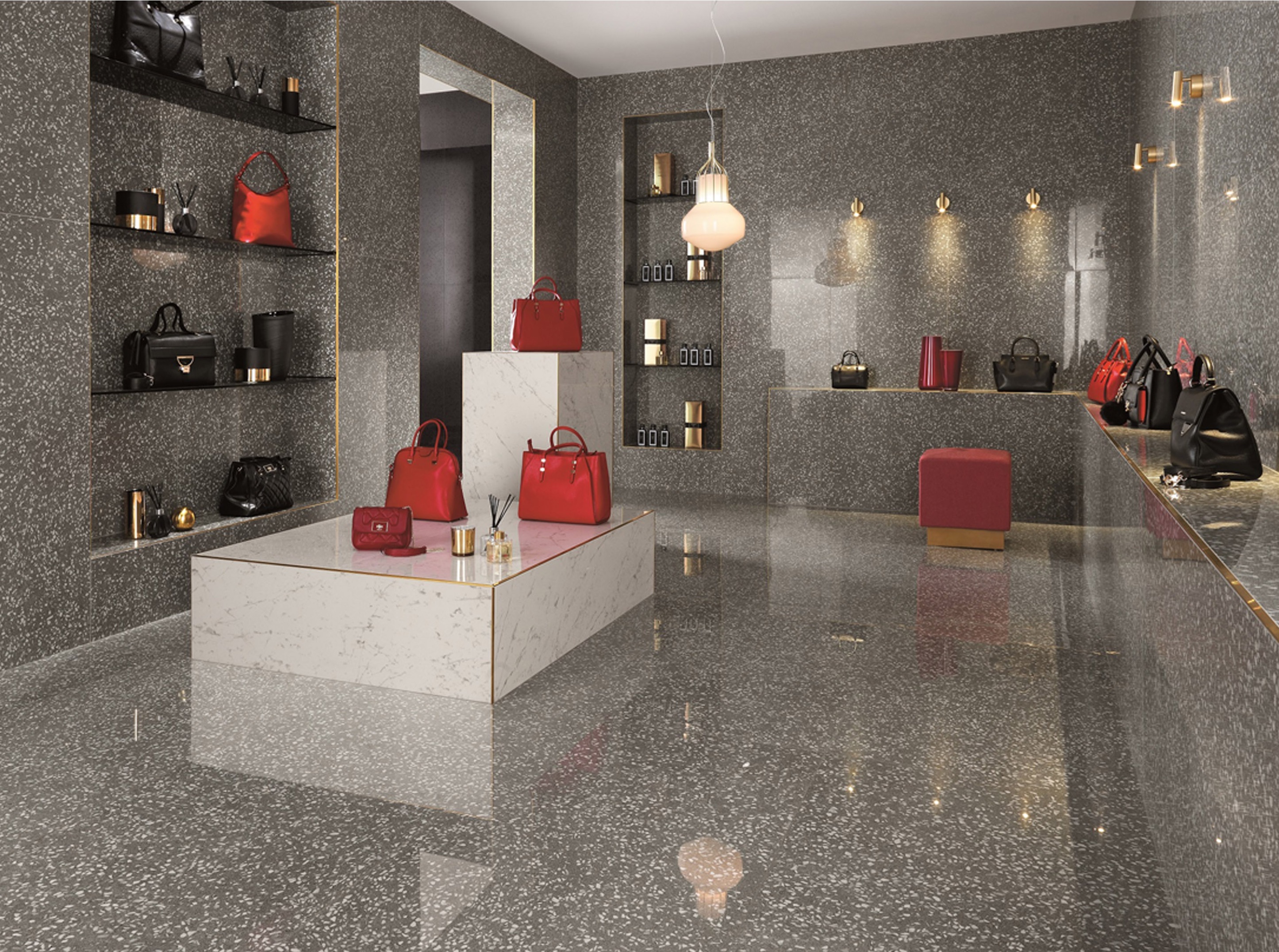人造大理石を再現した「GEMS」。450x900角4色、600角2色。1万3800円/m2。