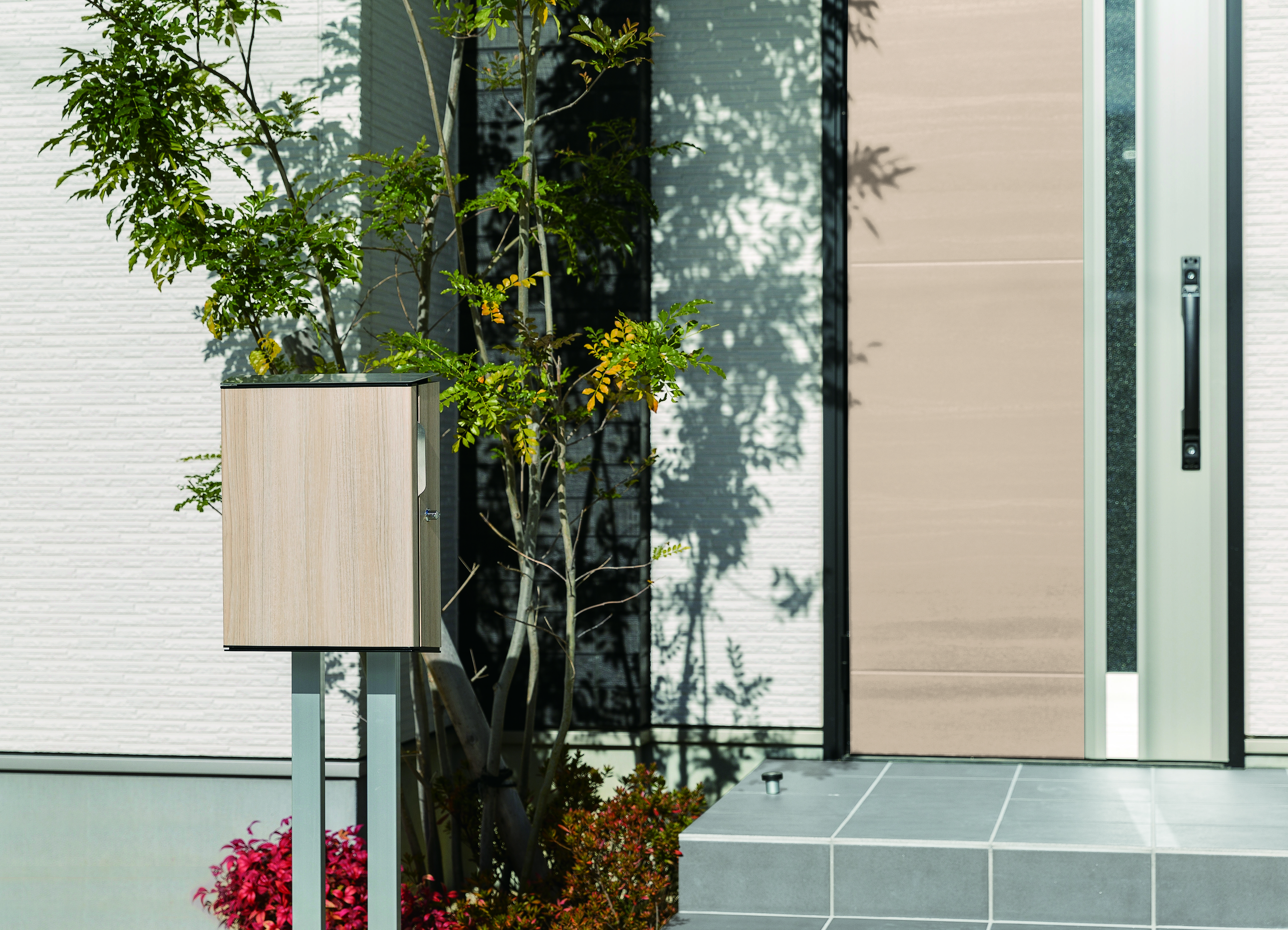 通常の郵便物のほか、サインや受領印が要らないメール便を不在時に受け取れるポスト。壁面に取り付ける壁付けタイプと、建物を引き立てる壁埋め込みタイプの2種類を用意した。 壁付けタイプの投函口は上部に付いており、正面の扉を開けて郵便物を取り出す。もう1つの壁埋め込みタイプの投函口は正面で、取り出しは背面から。 木目調3色、マットカラー3色。