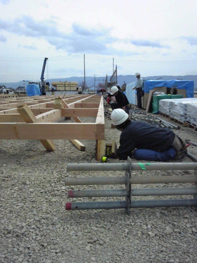 同社では、震災直後に国土交通省から仮設住宅建設の要請を受けた木住協を通じて、建設を請け負った。短工期を要するため、現場には最大75人の施工者を派遣し、建築を急ぐ。期間中は被災地の施工者を雇用するなど、独自の配慮も行っているという。