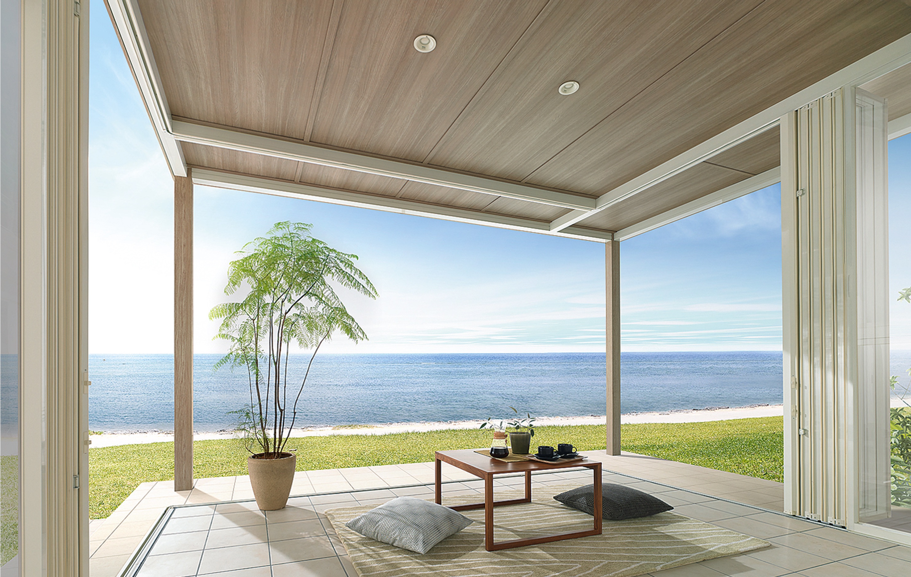 折戸パネルを全開にすると開放的な景色が味わえ、拡張した屋根によって雨が吹き込みにくくなるメリットも。