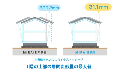カバヤは今年1月に木造2階建て住宅モデルによる振動台実験を実施。「ミライエ」の装着時と非装着時で、建物の上層と下層の揺れ幅(層間変位)を測定した結果、地震の揺れ幅を最大95%低減することが実証された。