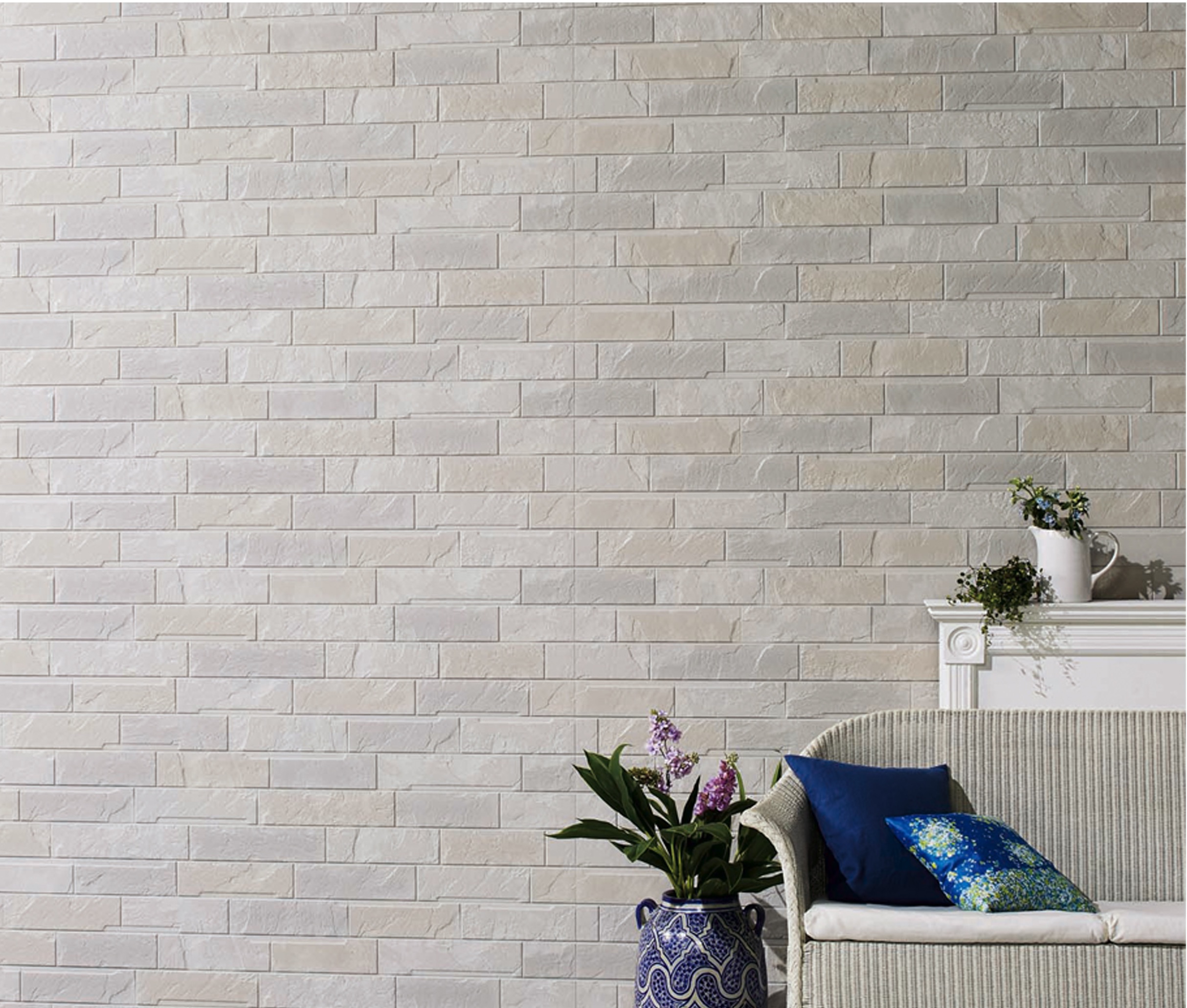 今回の新柄は、大割の石に切削痕や欠けをアクセントとして表現し、グラデーション塗装で高級感をもたせたモダンな石積柄。チャコール、グレー、ホワイトの3色をそろえた。15x455x3030mm。6600円/枚〜。