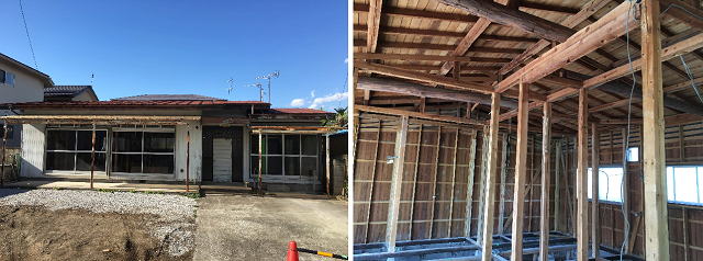 ココリノベモデルハウス施工前(左)と施工中(右)のようす