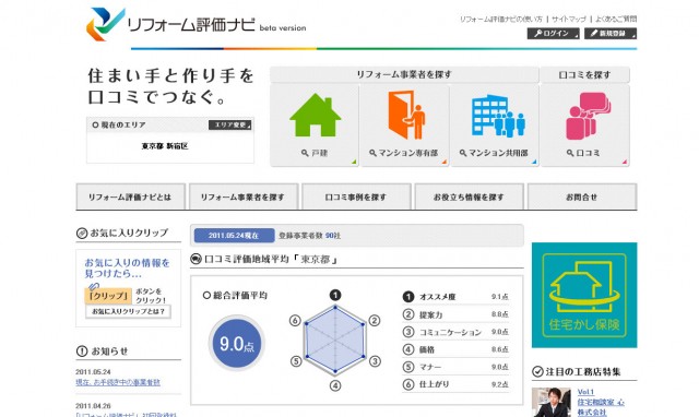 一般社団法人・住まいづくりナビセンターは、リフォーム業者を口コミ評価する「リフォーム評価ナビ」を開設、サービスを開始した。