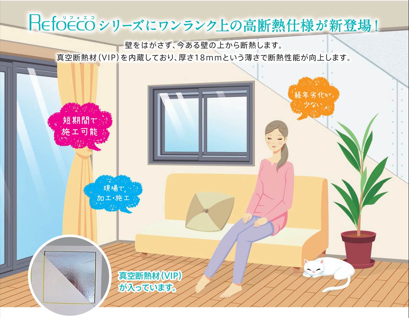旭ファイバーグラス(東京都千代田区)は7月21日、部屋単位で断熱リフォームができる「リフォエコ」シリーズから、熱伝導率0.004W/(m・k)の真空断熱材(VIP)を内蔵することで断熱性能を大幅に向上した「リフォエコVIP(ビップ)」を省エネ基準地域区分4~7地域で発売した。