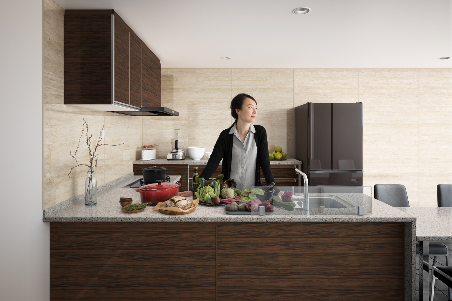 家族構成やライフスタイルの変化に対応し、機能性、素材、デザイン、コーディネート性を追求しつつ、手入れのしやすさ、たっぷり収納、効率のよい調理性に配慮。また、今回はとくに「本質的な美しさ」にこだわり、扉のデザイン・色、ワークトップの質感など細部も重視した。 72万7000円(間口255cm、足元スライドタイプ基本セット)。