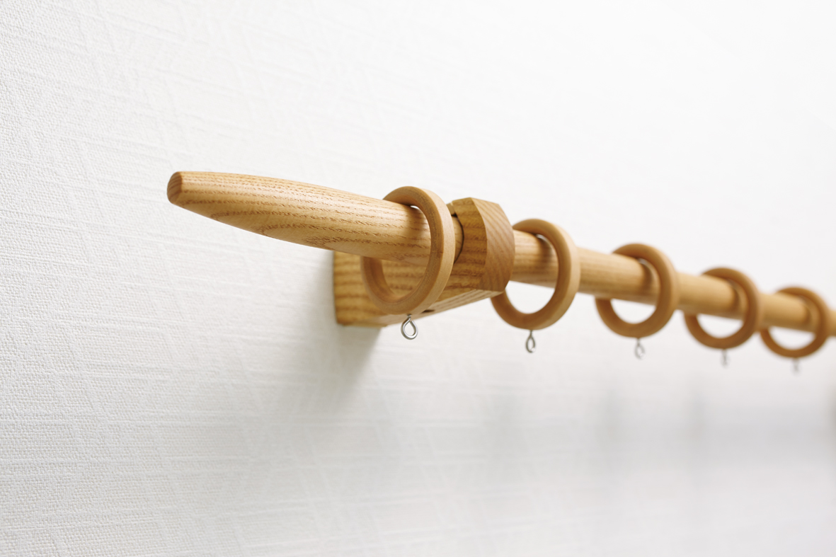 家具とのコーディネートを重視し、ナチュラルな木目を活かしたカーテンレール。ポールとキャップの継ぎ目をブラケットで隠すことにより、1本の木から削りだしたような一体感のあるポールとキャップデザインを実現した。 アッシュ、オーク、チェリー、ウォールナットの4色。